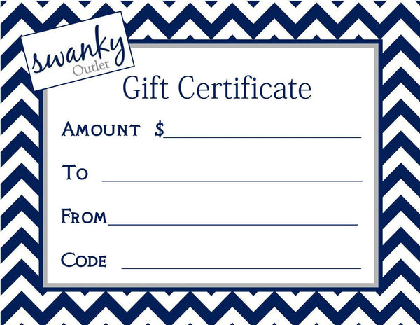 The perfect gift! A Swanky Gift Certificate is a great way to say, "Thanks", "I Love You", "Congratulations", "Happy Birthday", etc. Just choose the value of the gift certificate that best works for you - a physical certificate will be mailed to your shipping address with a coupon code that can be redeemed during the checkout process.